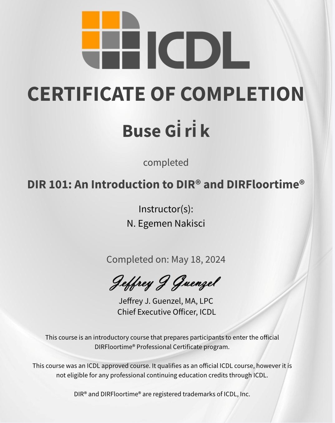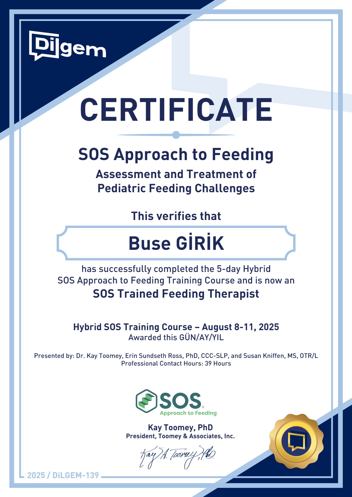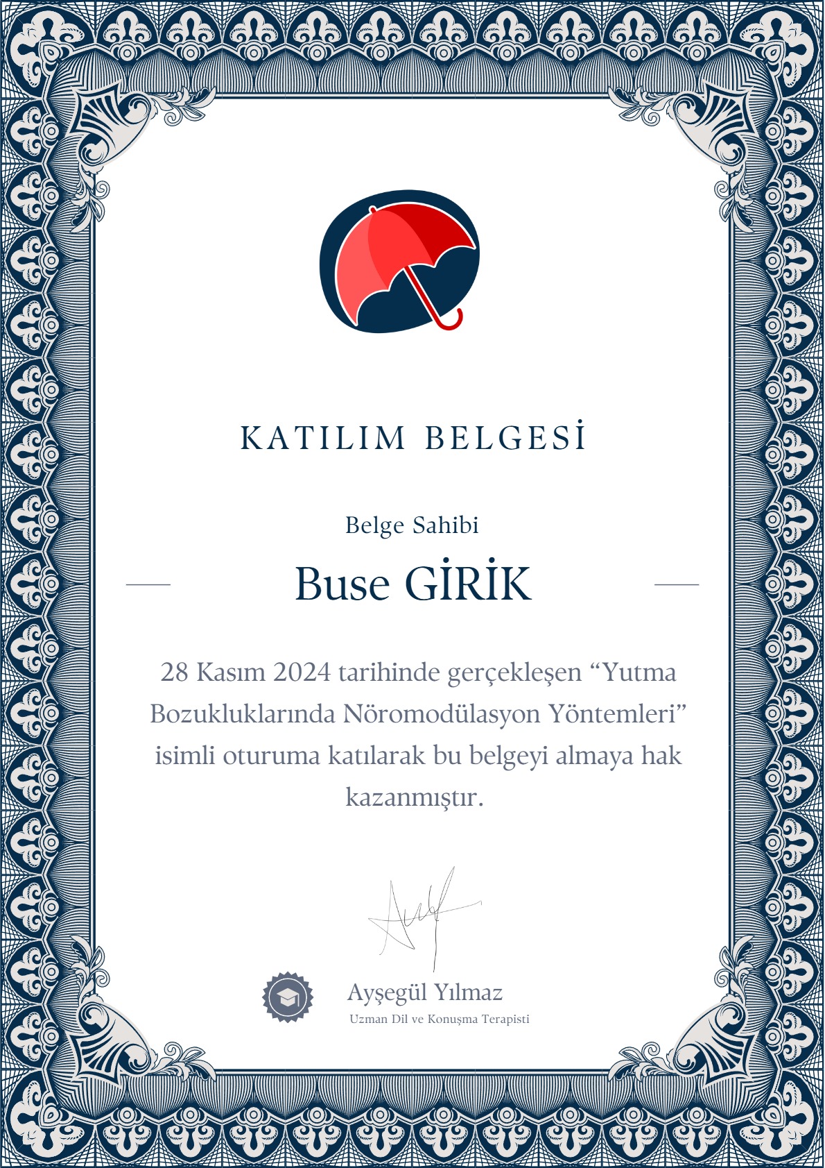 Ben Buse Girik. 2019 yılında Elbistan Fen Lisesi’nden mezun olduktan sonra, Anadolu Üniversitesi Dil ve Konuşma Terapisi bölümünde lisans eğitimimi tamamladım. Üniversite sürecinde edindiğim teorik bilgileri, Osmangazi Tıp Fakültesi, DİLKOM (Dil ve Konuşma Bozuklukları Uygulama ve Araştırma Merkezi) ve çeşitli rehabilitasyon merkezlerinde yaptığım stajlarla pekiştirme fırsatı buldum. Eğitimim ve deneyimlerim boyunca farklı yaş gruplarıyla çalışma, dil ve konuşma bozukluklarının değerlendirilmesi ve terapisi alanlarında aktif görev aldım. Alanıma duyduğum ilgi ve insanlarla etkili iletişim kurma becerim, mesleki gelişimime yön veren en önemli motivasyon kaynaklarım oldu.Sertifikalar